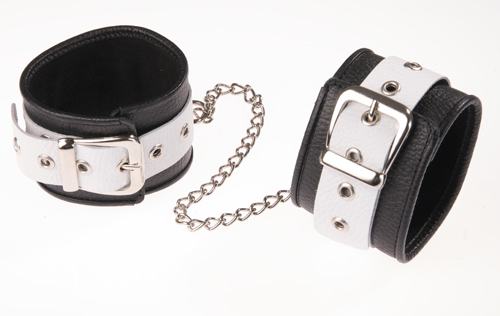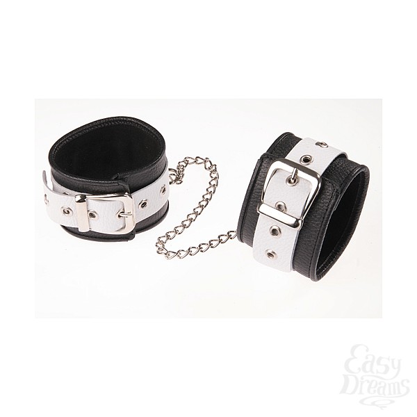 Секс шоп » БДСМ / Фетиш » Наручники / Фиксация » Оковы, поножи » Оковы кожаные черные с белым широким ремешком, соединенные цепочкой длиной 35см 3072-13