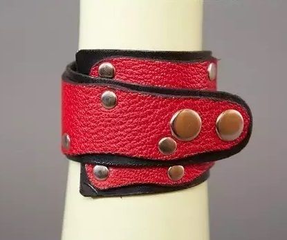 Секс шоп » БДСМ / Фетиш » Наручники / Фиксация » Напульсники, манжеты » Красно-чёрный кожаный браслет «Треугольник»